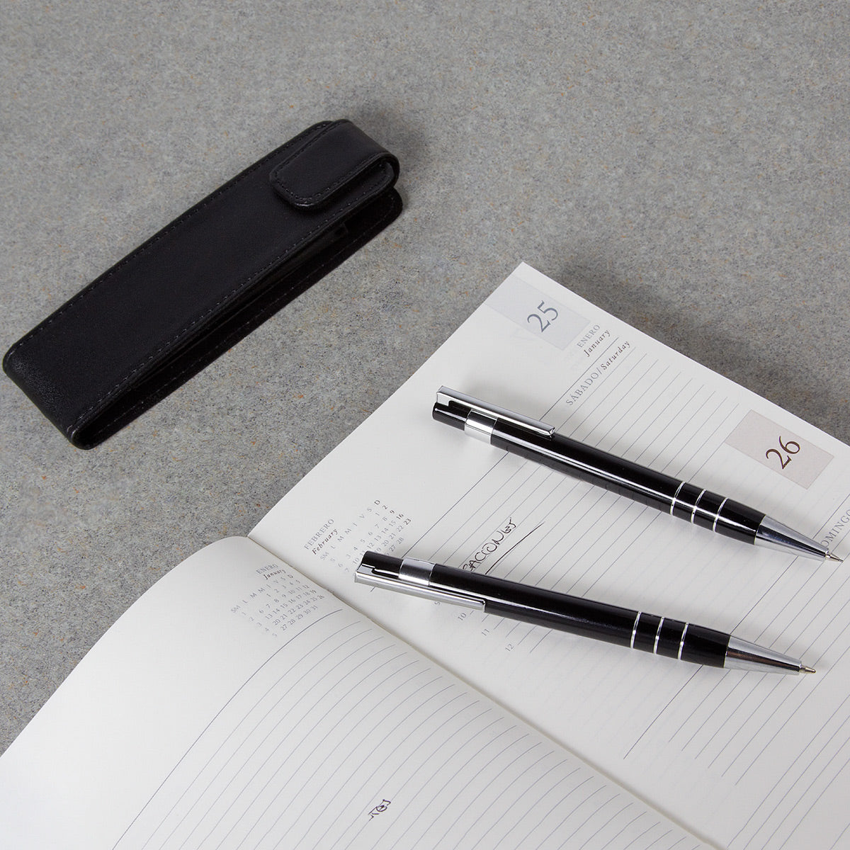 Bolígrafo y lapicera 0.5 mm. Mecanismo pulsador. Incluye estuche con imán para cerrado.