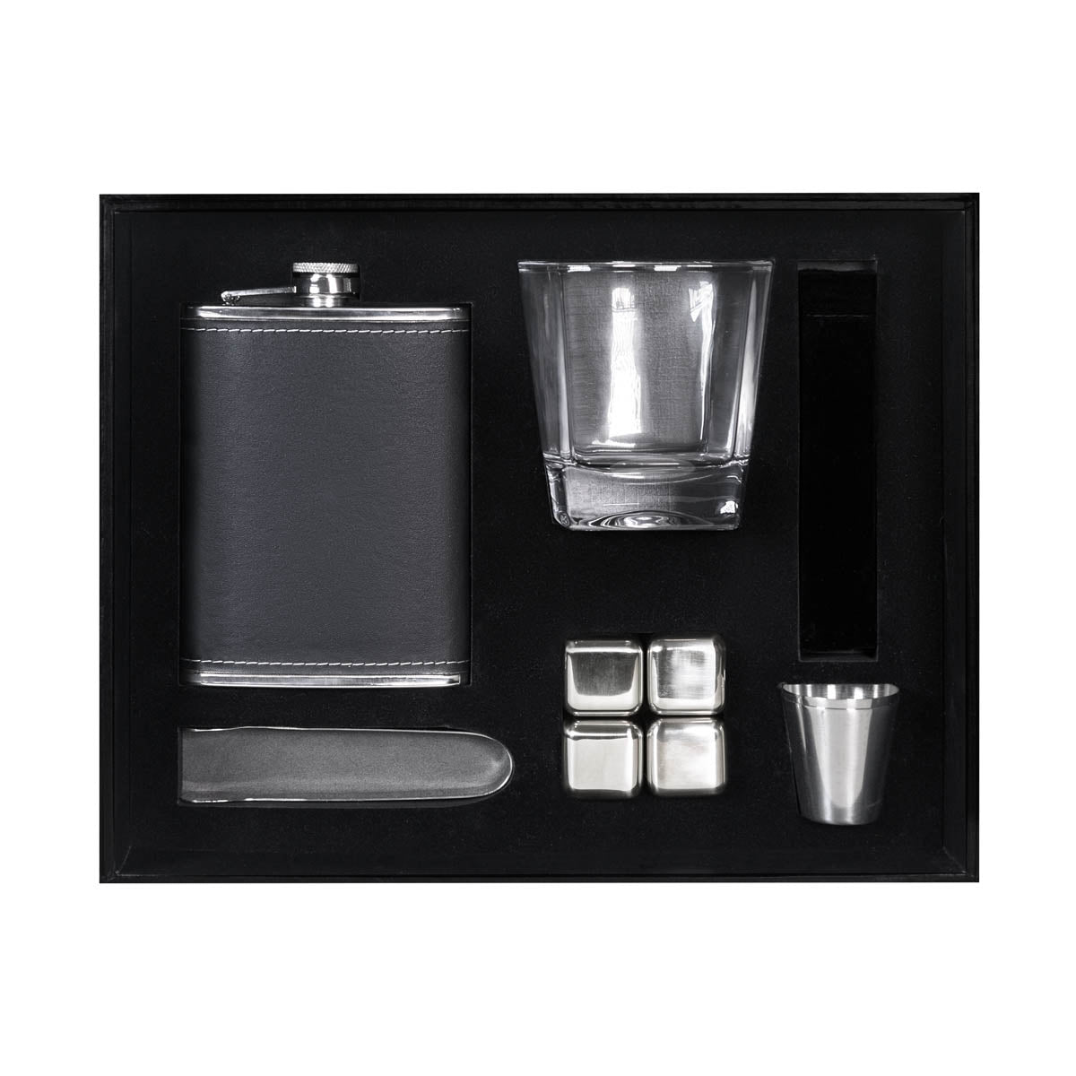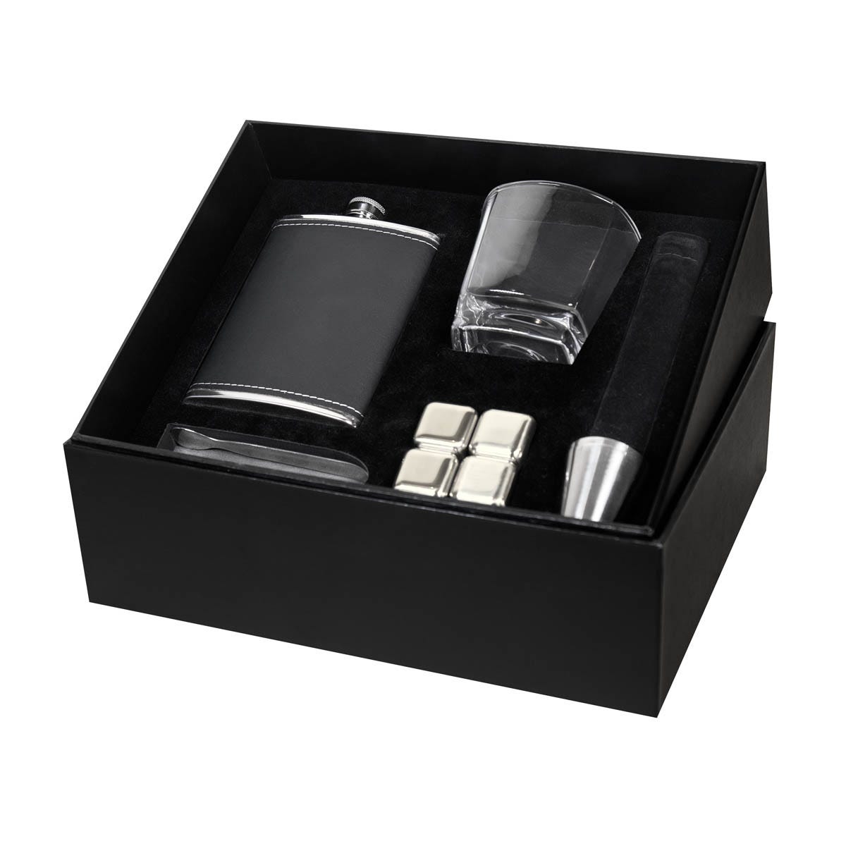 Set de bar. Incluye caja rígida de regalo, licorera con funda de curpiel y tapa con rosca para evitar derrames, vaso de cristal, set de 4 cubos enfriadores con funda de terciopelo, pinzas para hielo y 2 mini vasos metálicos.