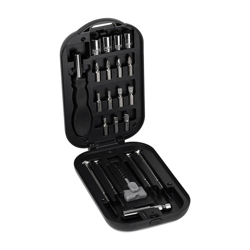 Contiene cúter, 4 desarmadores de relojero, dado extensión, 4 dados, desarmador con 10 puntas diferentes e intercambiables. Incluye estuche.