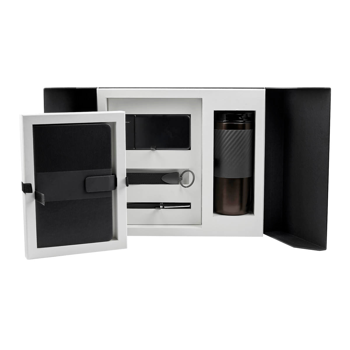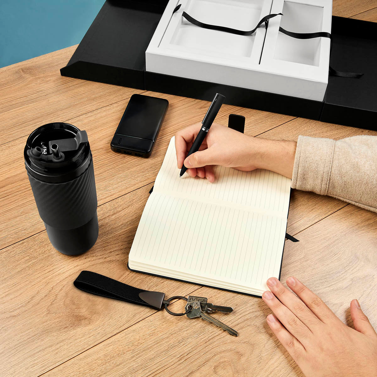 Exclusivo set de regalo. Opción perfecta para un obsequio de alto valor y calidad. Este set viene en una elegante caja negra con solapa de abertura central, lo que no solo proporciona un acceso fácil al contenido, sino que también añade un toque sofisticado al diseño. El interior de la caja presenta un color neutro que realza el aspecto general, creando un hermoso contraste con el exterior negro. Incluye termo con doble pared metálica, cerrado al vacío, tapa con sistema de rosca, sobretapa de push y ranura especial con tapón para popote, también incluye popote metálico con boquilla de silicón. Libreta de 80 hojas de raya, cubierta rígida de curpiel, separador interno y broche magnético. Bolígrafo metálico con sistema twist y terminado rubber. Llavero metálico combinado con curpiel, aro con giro de 360°. Batería auxiliar para smartphone de 10,000 mAh, incluye 2 puertos USB, 1 micro USB y 4 LEDs indicadores de carga.