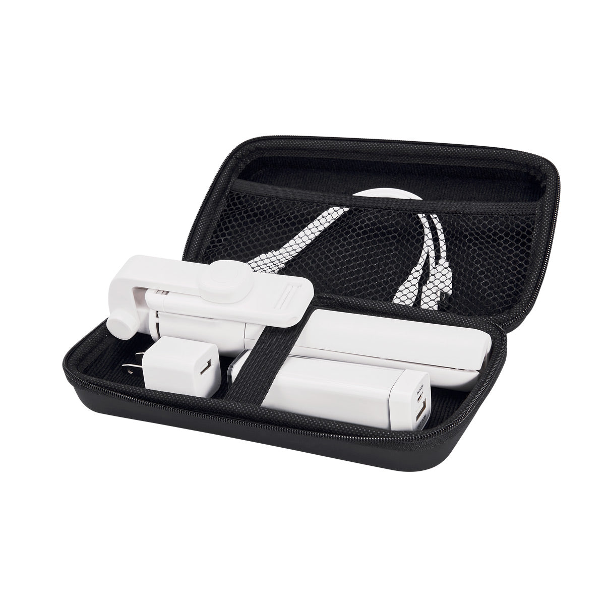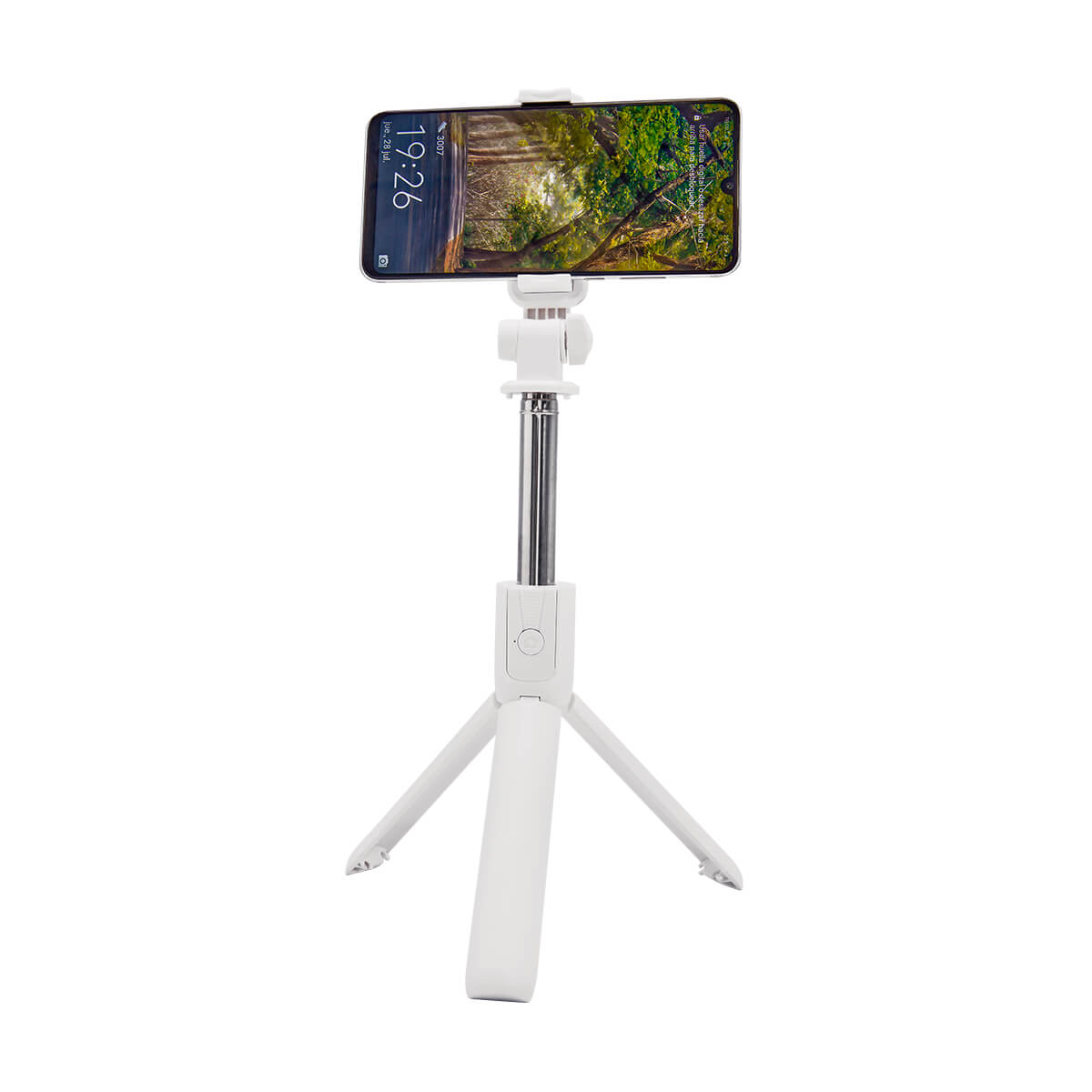 Incluye selfie stick inalámbrico con bluetooth y control remoto para accionar la cámara a distancia. Batería auxiliar de 2,200 mAh, cargador de pared, cable cargador USB 3 en 1 (micro USB, tipo C y lightning) y estuche.