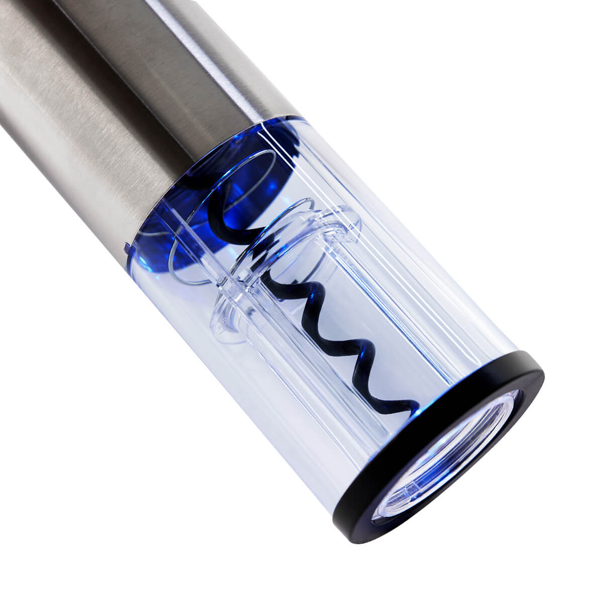 Set de sacacorchos eléctrico. Ideal para los amantes del vino. Contiene 1 sacacorchos con batería recargable y puerto tipo C, 1 cortador de papel aluminio, 1 vertedor para evitar salpicaduras, 1 tapón protector de vacío y 1 base para organizar los diferentes accesorios. Incluye cable auxiliar, manual de uso y caja individual.