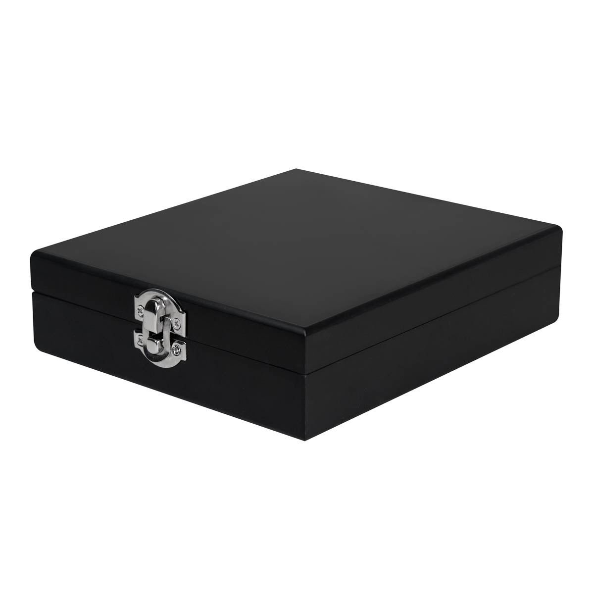 Incluye sacacorchos con navaja y destapador, stopper, arillo, termómetro, cortador y caja de madera con cerrojo tipo hebilla.