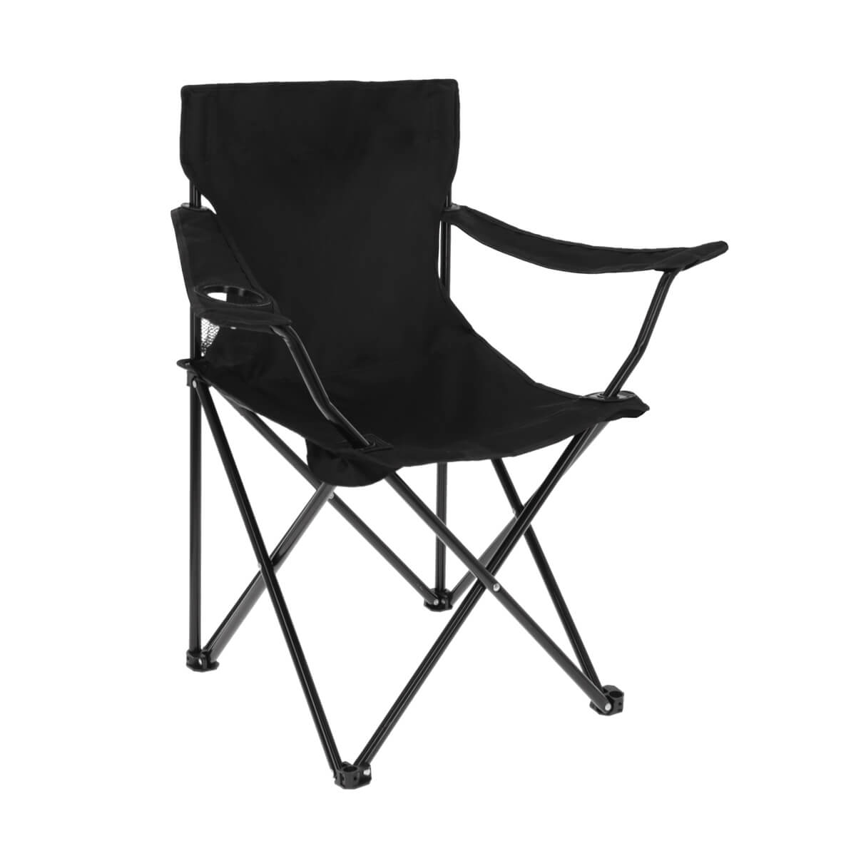 Silla plegable de fácil armado con reposabrazos, porta vasos de malla y funda con jareta y correa.