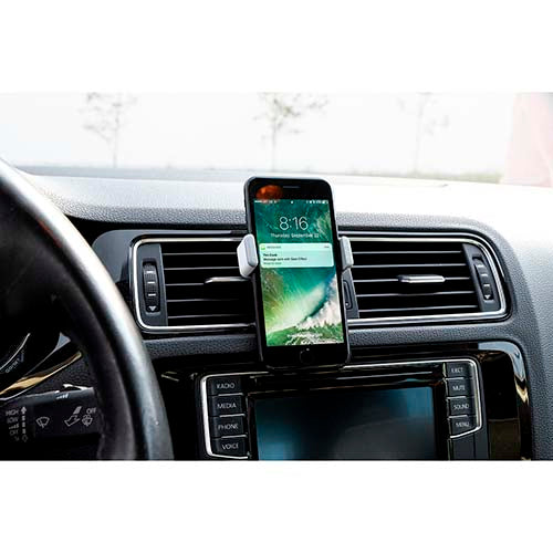 Soporte con mecanismo ajustable para smartphones de 6 a 8 cm de ancho. Ángulo de rotación de 360°. Se monta en las ventilas del aire acondicionado.