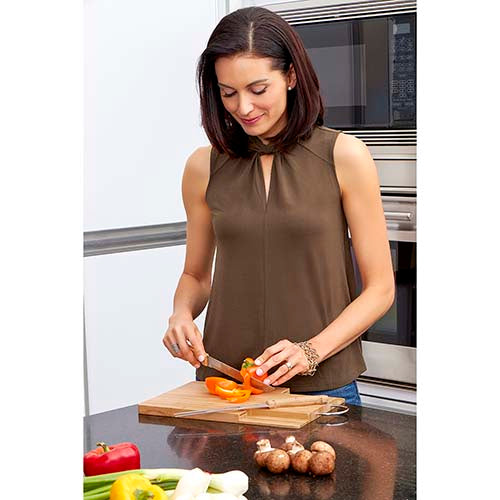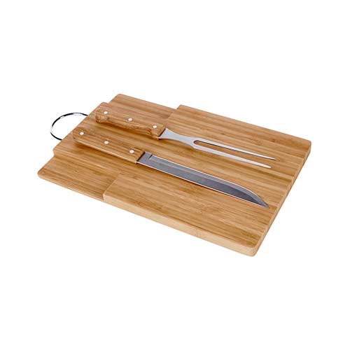 Tabla de cocina. Incluye tenedor y cuchillo. Incluye caja individual. La madera es un producto natural el cual puede presentar variaciones en tonalidades y vetas.