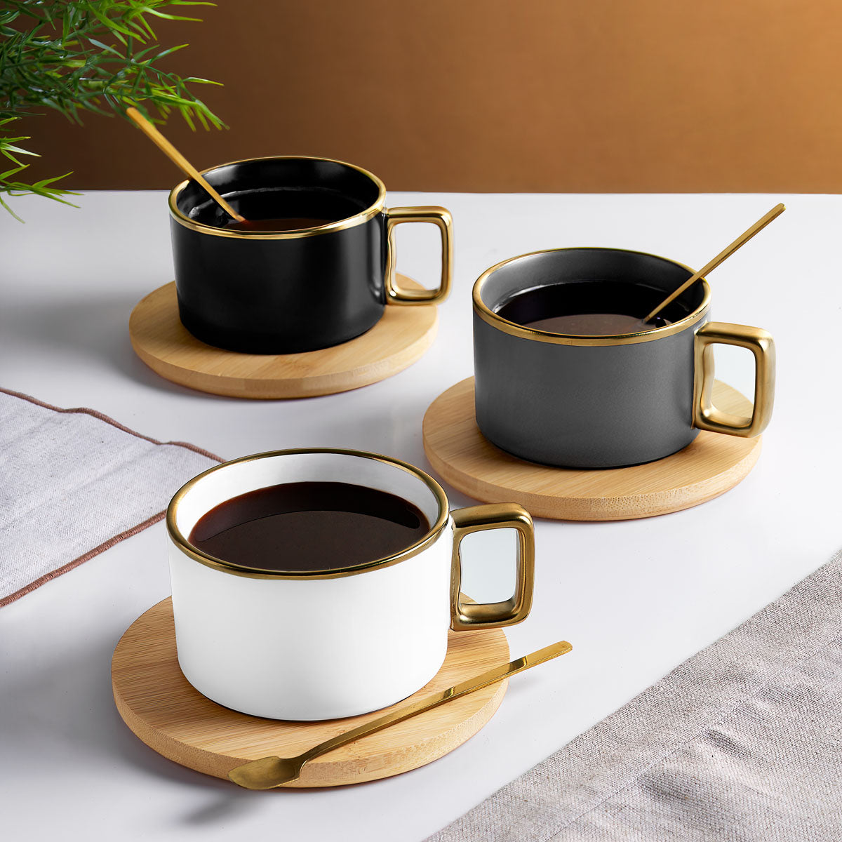 Taza de cerámica con base de bambú y cuchara metálica dorada. Terminado mate con detalle dorado en filo y asa. Incluye caja individual. El bambú es un producto natural el cual puede presentar variaciones en tonalidades y vetas.