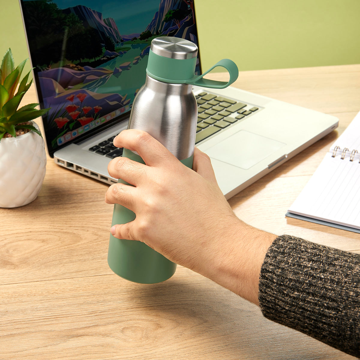 Termo doble pared. Cerrado al vacío. Pared interna y externa acero inoxidable. Tapa con sistema de rosca. Asa de silicón que permite llevarlo a todos lados. Mantiene temperatura caliente 6 hrs y temperatura fría 8 hrs aproximadamente. Incluye caja individual.
