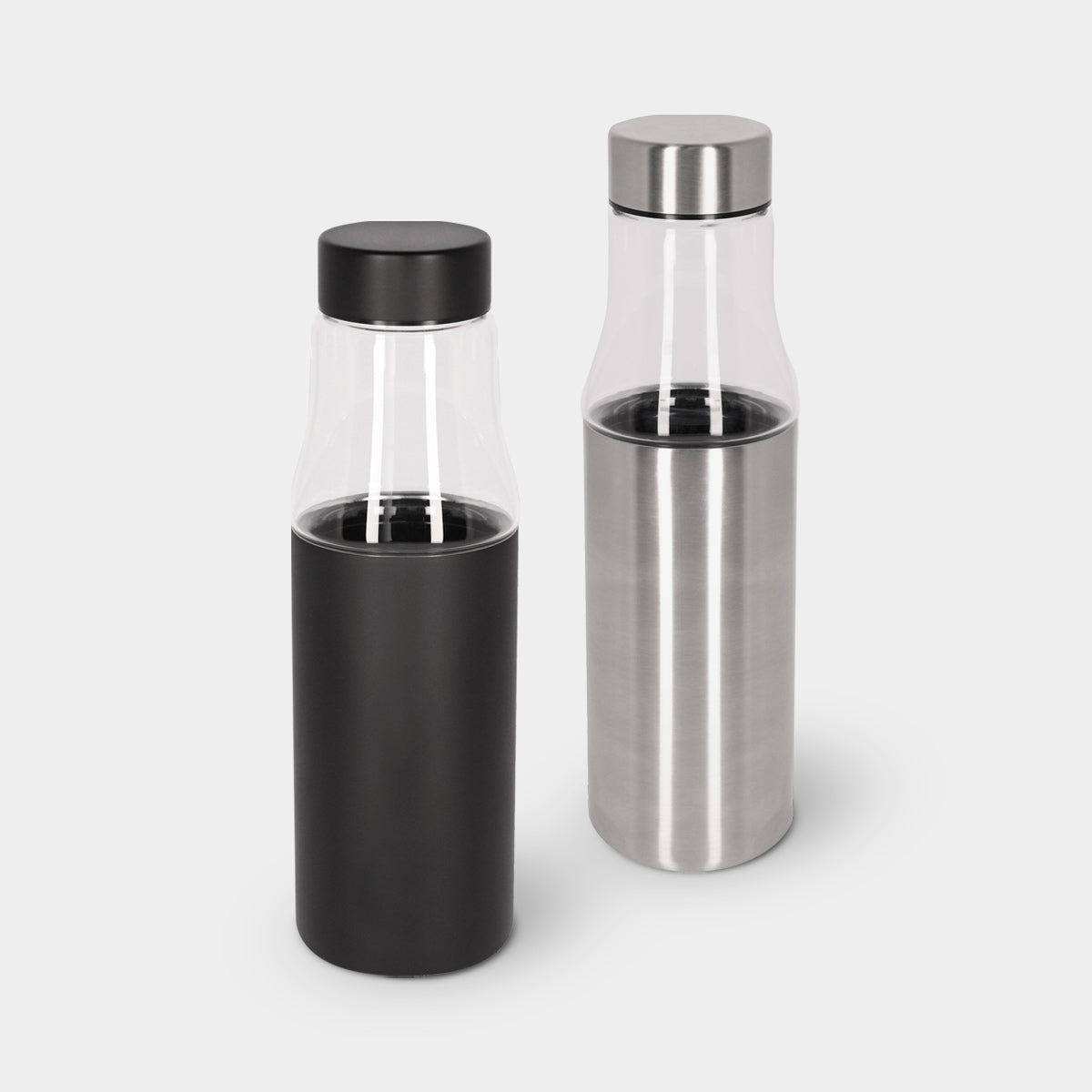Termo de vidrio doble pared con base exterior de acero inoxidable desprendible. Cerrado al vacío para conservar el frío o calor de la bebida. Tapa de metal de rosca. La base desprendible puede ser utilizada como vaso. Incluye caja individual.