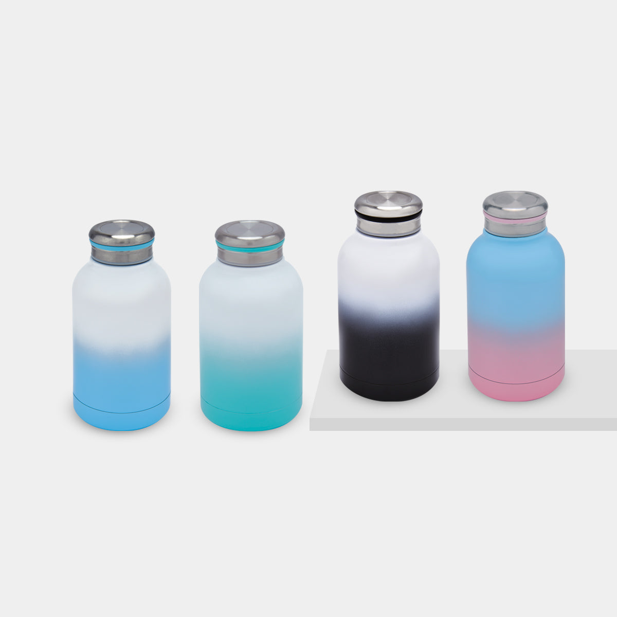 Mini termo color degradado. Doble pared. Cerrado al vacío. Pared interna y externa de acero inoxidable. Mantiene temperatura caliente 6 hrs y temperatura fría 8 hrs aproximadamente. Tapa con sistema de rosca. El termo es pintado a mano, por lo que el color y degradado pueden variar. Incluye caja individual.