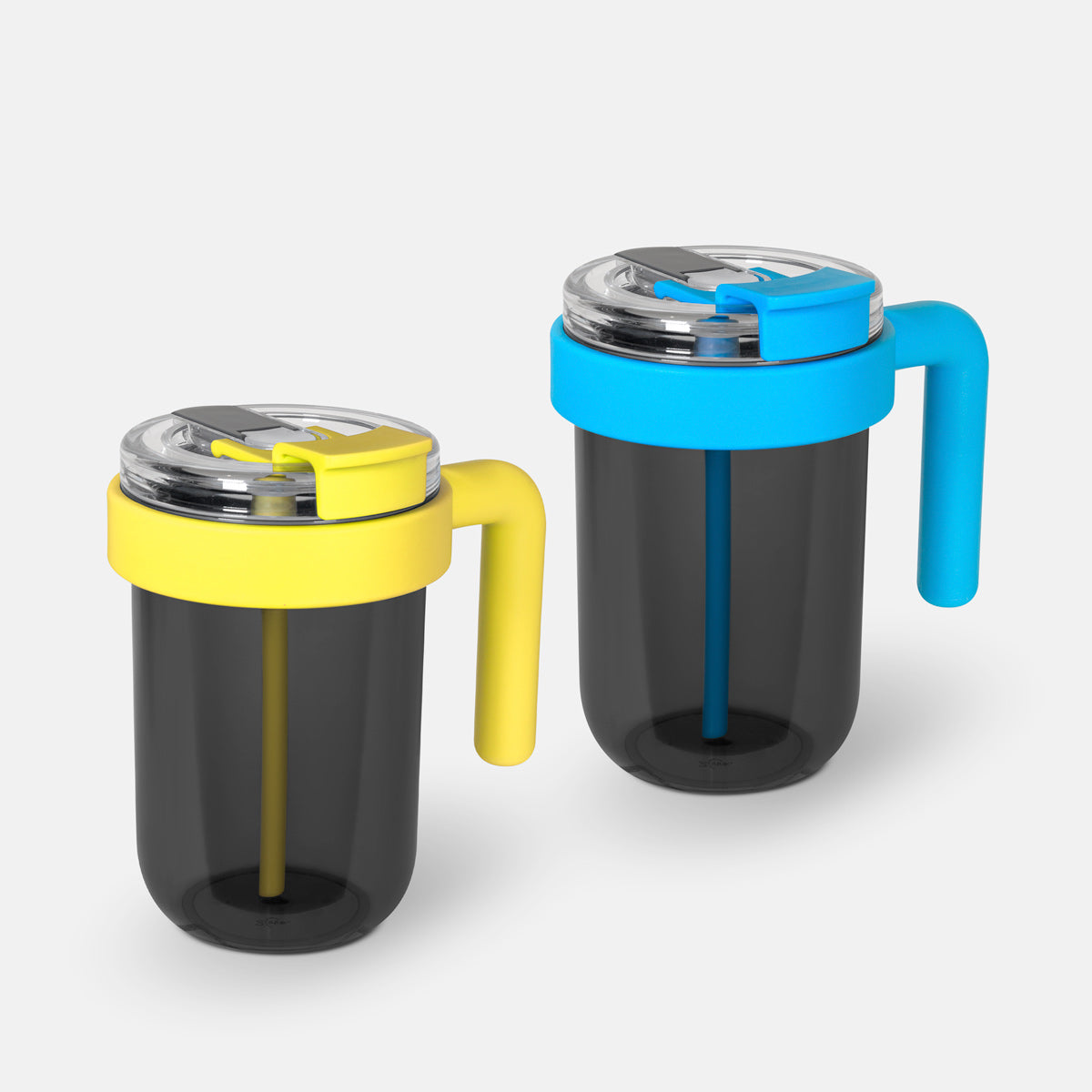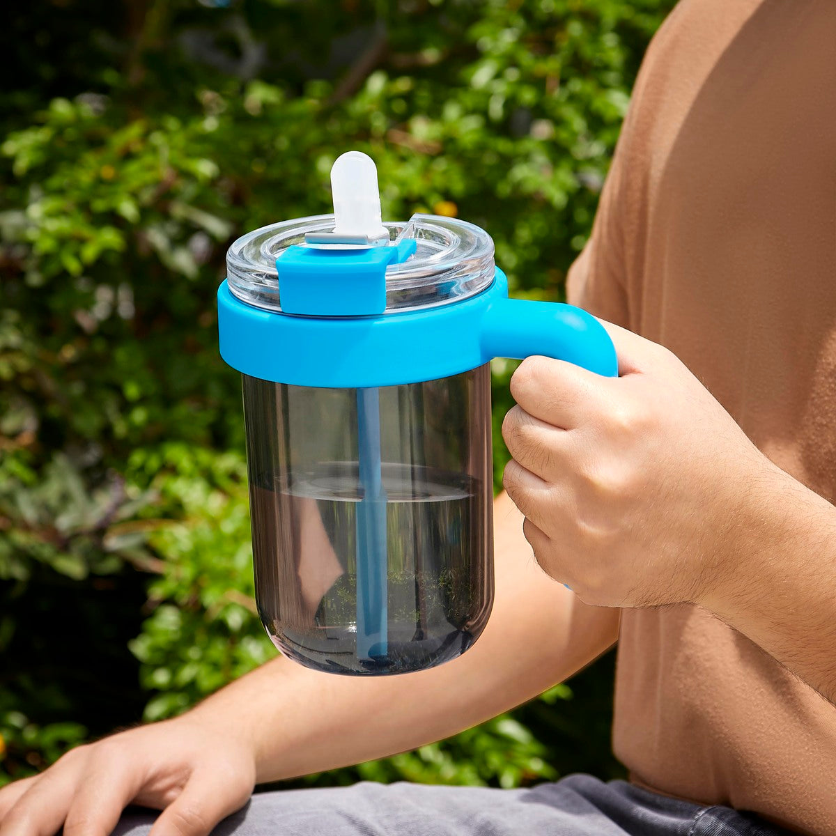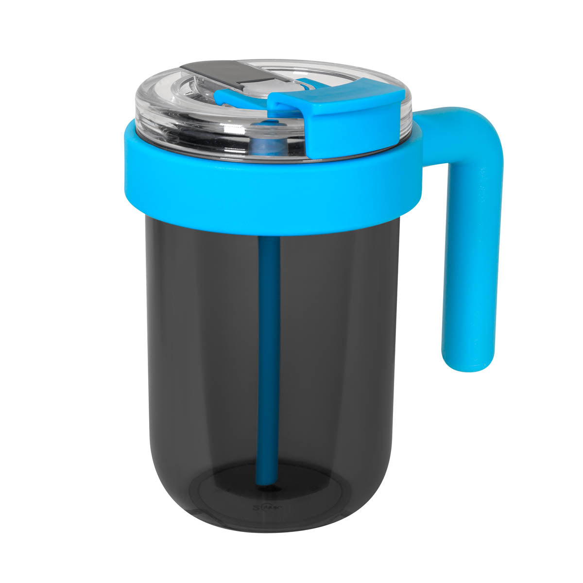 Termo de plástico de una pared. Tapa de plástico con sistema de rosca, sobre tapa con sistema de push y boquilla plegable con popote integrado. Es fácil de usar y perfecto para llevar en cualquier actividad. Su asa grande y ergonómica, permite un agarre más cómodo. Su combinación de colores, con un cuerpo oscuro translúcido y acentos en color sólido en el asa, popote y tapa, le da un toque moderno y atractivo. Incluye caja individual.
