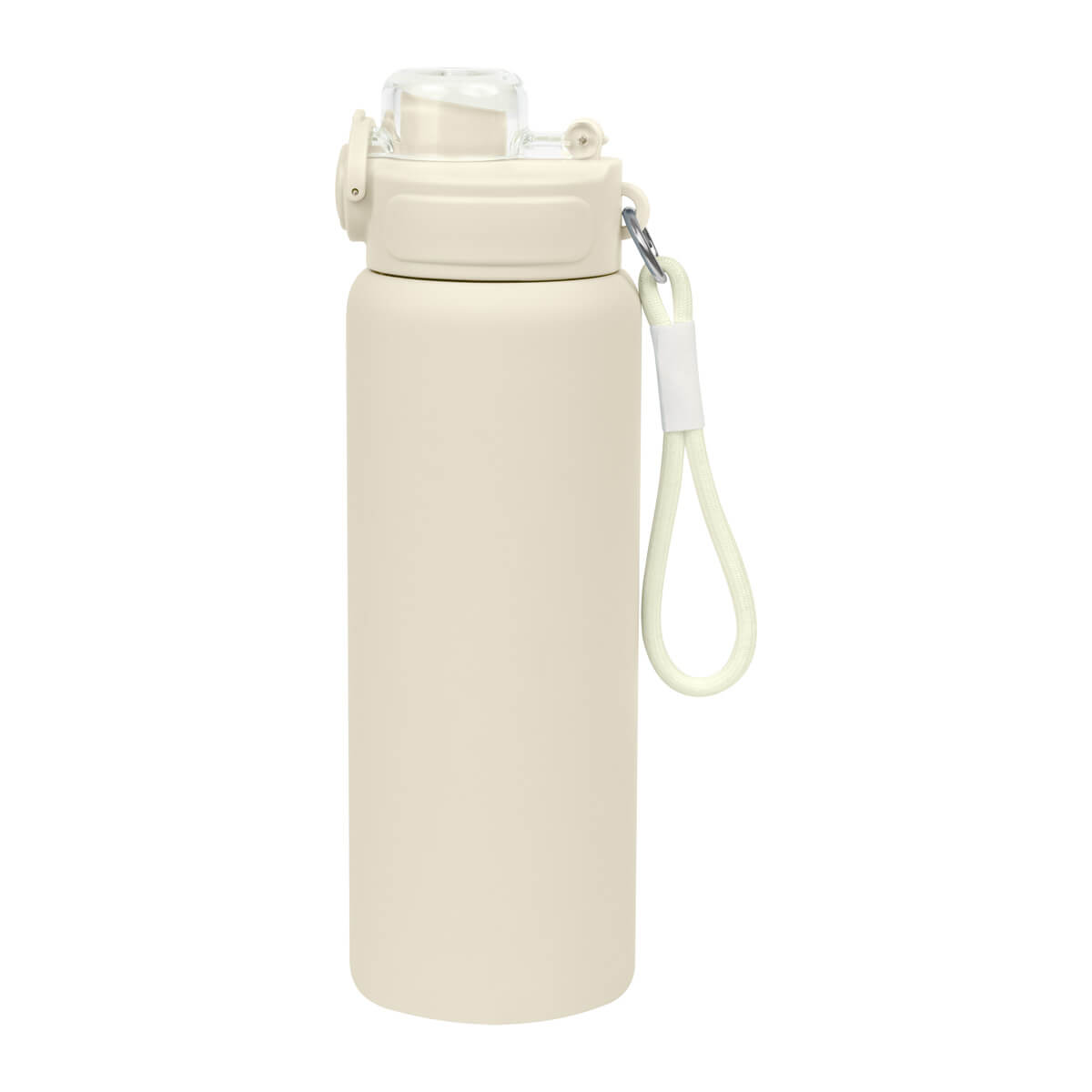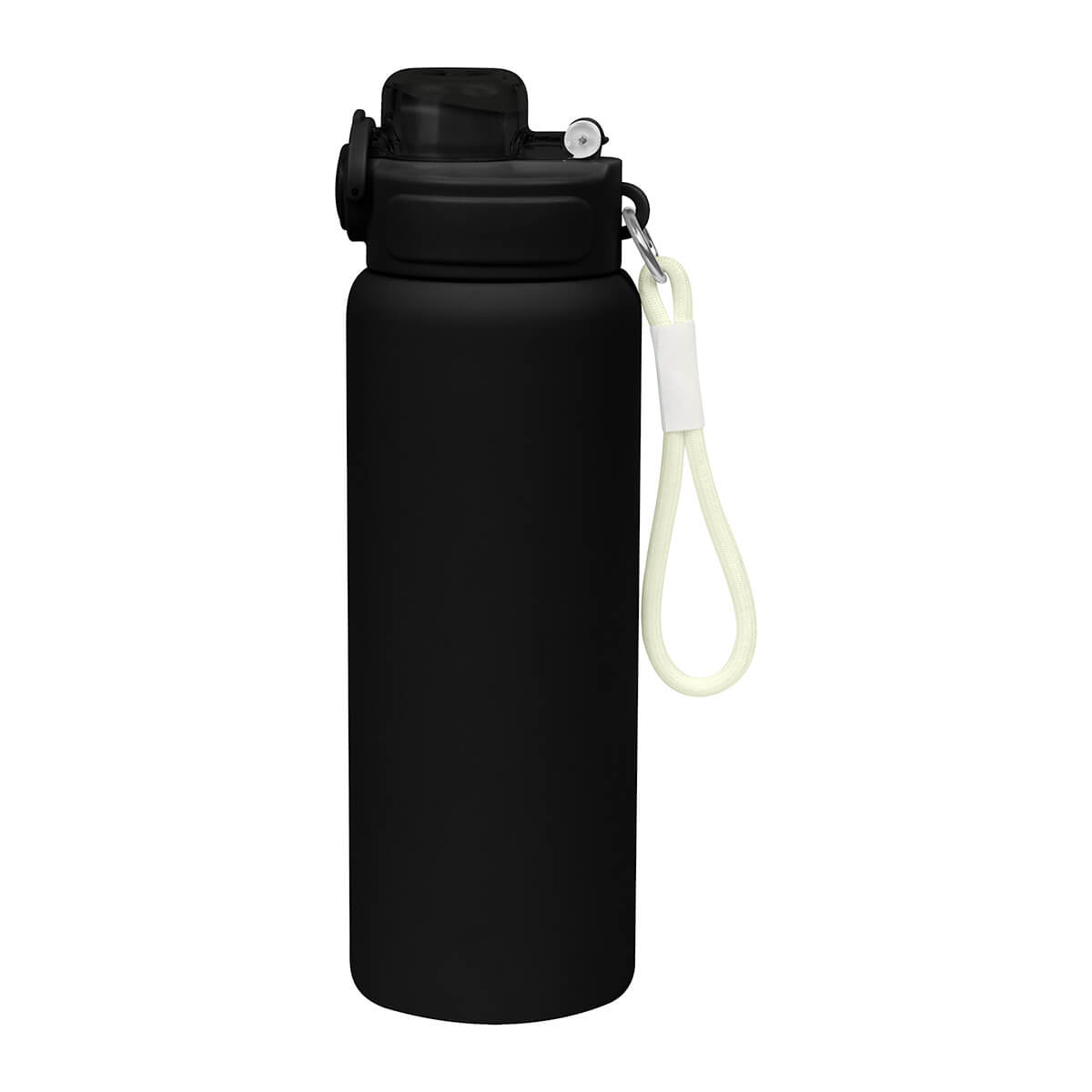 Termo doble pared. Cerrado al vacío. Pared interna y externa de acero inoxidable. Cuerpo con terminado tipo rubber, que lo hace suave al tacto. Tapa con cierre de rosca y sobre tapa tipo push para mantenerla seguro y limpio. Además con su nuevo diseño de boquilla, ofrece dos alternativas de uso, para beber normal o por medio de popote, ambas en la misma boquilla, sin ranuras adicionales. Mantiene temperatura caliente y fría por 8 hrs. Capacidad 27 Oz. Incluye asa de poliéster, popote de plástico y caja individual.