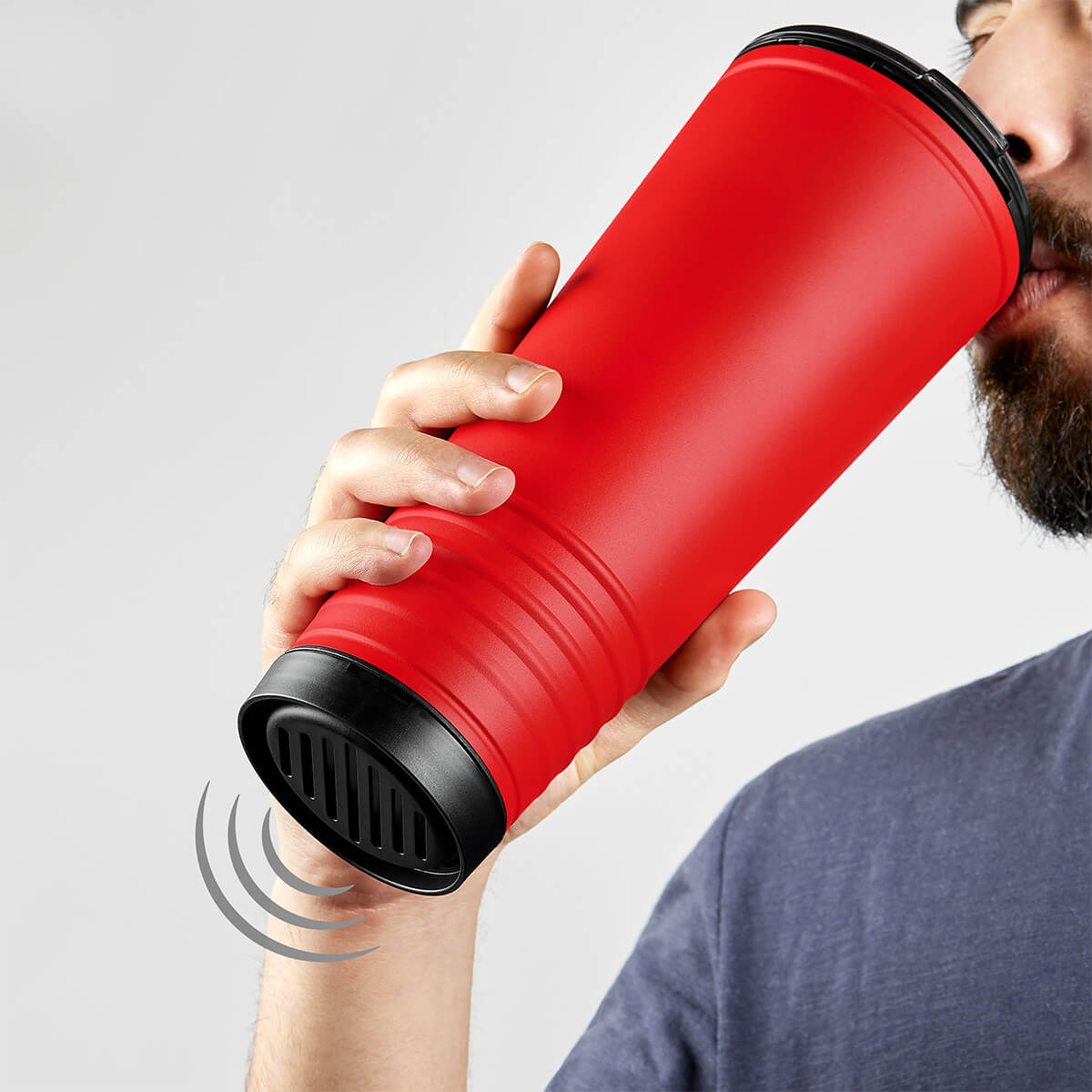 ¡Lleva la emoción de los eventos deportivos al siguiente nivel! Termo equipado con una boquilla especial en la tapa que realiza una doble función; como trompeta, para animar tu evento favorito y al mismo tiempo, disfrutar de tu bebida preferida. Termo doble pared. Pared interna de plástico y externa de acero inoxidable. Tapa de plástico con sistema push y válvula de seguridad. Capacidad de 24 Oz. Base de 7 cm de diámetro. Incluye caja individual.
