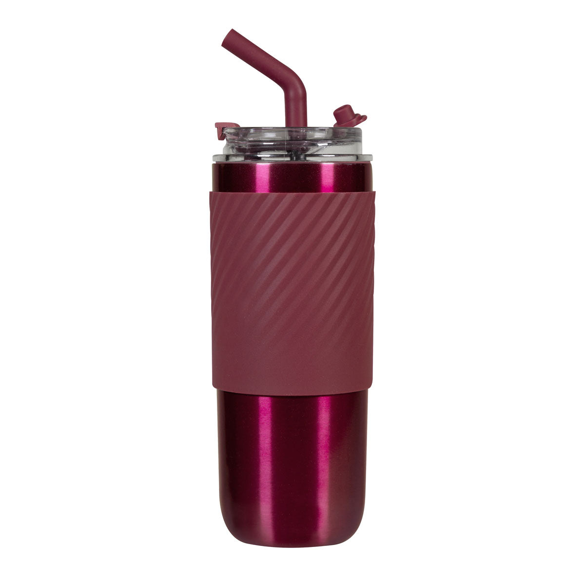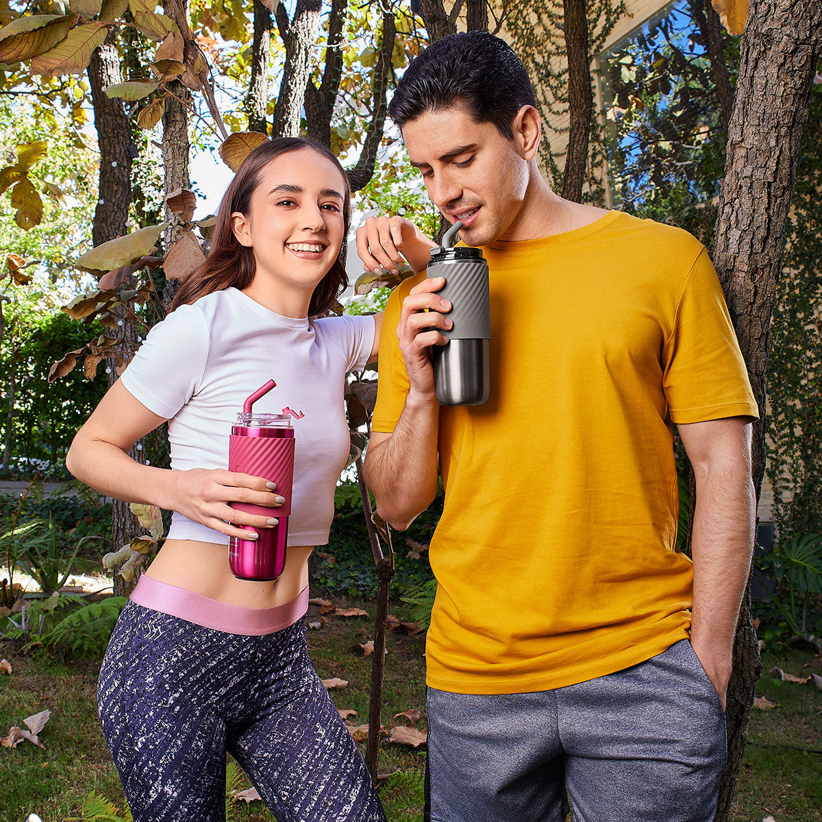 Doble pared. Cerrado al vacío. Pared interna y externa de acero inoxidable.Tapa con sistema de rosca, sobretapa de push y ranura especial con tapón para popote. Incluye popote metálico con boquilla de silicón. Banda de silicón antiderrapante. Mantiene la temperatura caliente por 6 hrs y fría 12 hrs aproximadamente.Caja individual incluida.