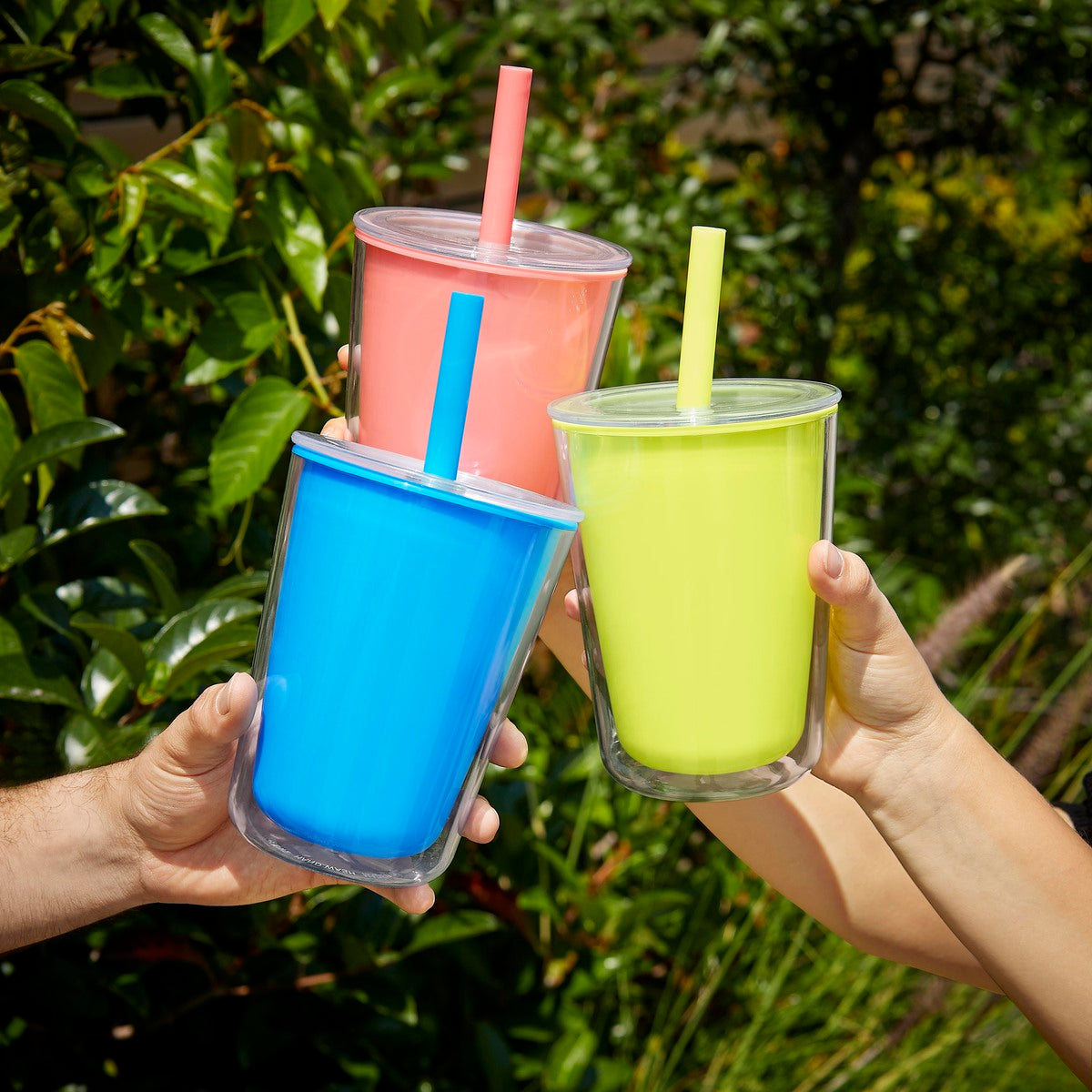 Vaso de plástico doble pared. Su peculiar diseño, cuenta con una pared interna de color y una pared externa transparente, que le da un aspecto moderno y vibrante. La tapa con cierre push y el popote a juego, añaden originalidad a este vaso. Ideal para llevar tus bebidas favoritas a donde vayas. Capacidad de 23 Oz. Base de 9 cm de diámetro. Incluye caja individual.